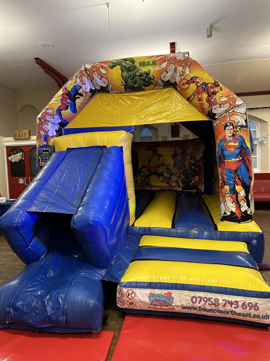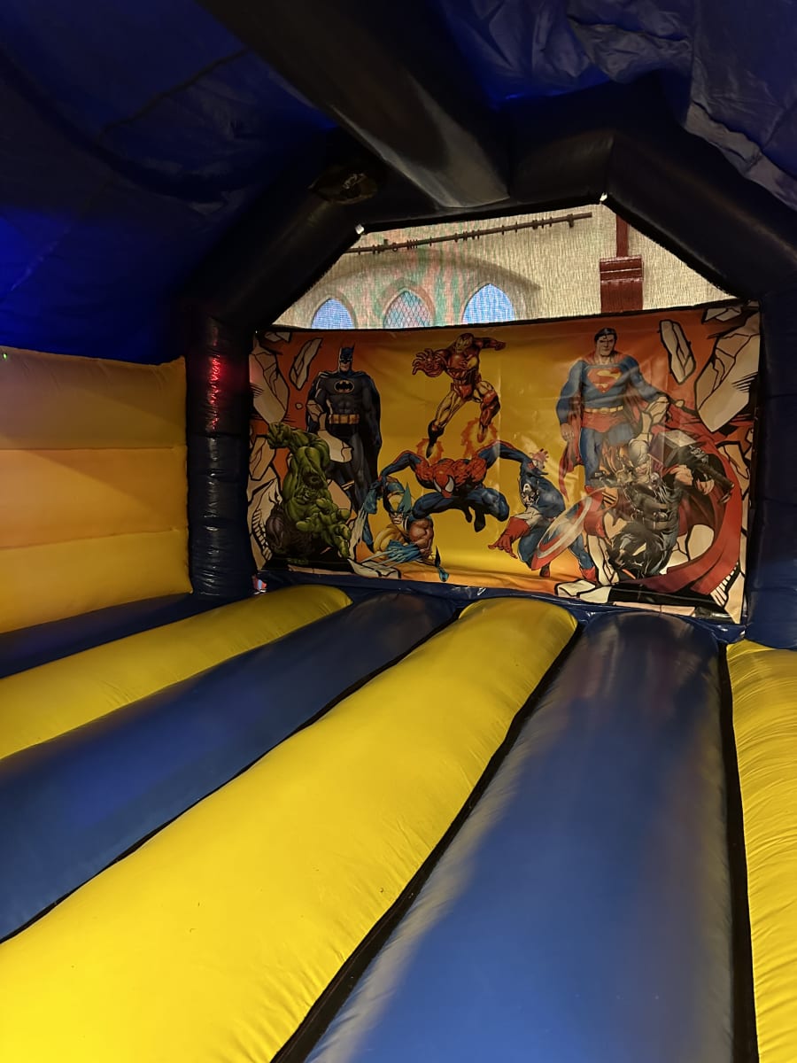 Superhero Bouncy Castle with slide! With comic book style artwork, this is the ideal castle for your little superhero fans 🦸♀️ It’s enclosed top makes for an amazing staging area for groovy disco lights! The more open slide makes supervisions easier so you can relax! The dimensions of this awesome unit are 18ft deep, 12ft wide and 11ft tall.