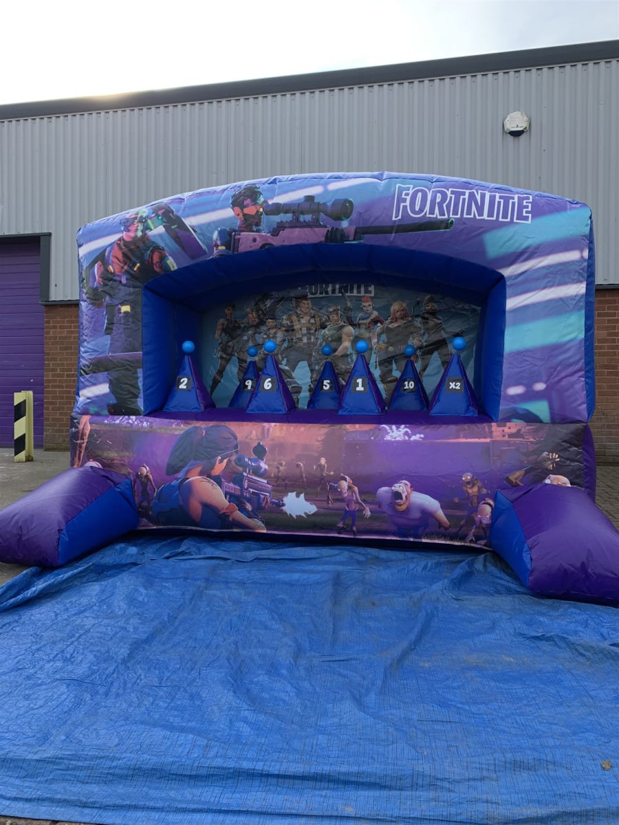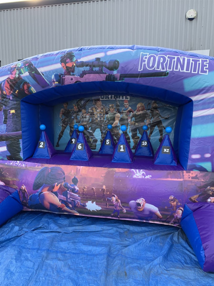 Fortnite themed Inflatable target shooter game. For use with guns. Float light plastic balls above the air jugglers and take aim with your guns! See who can get the highest score!