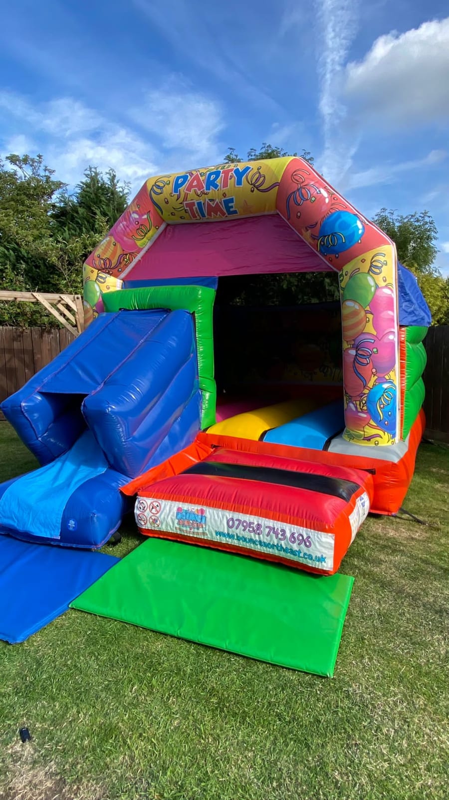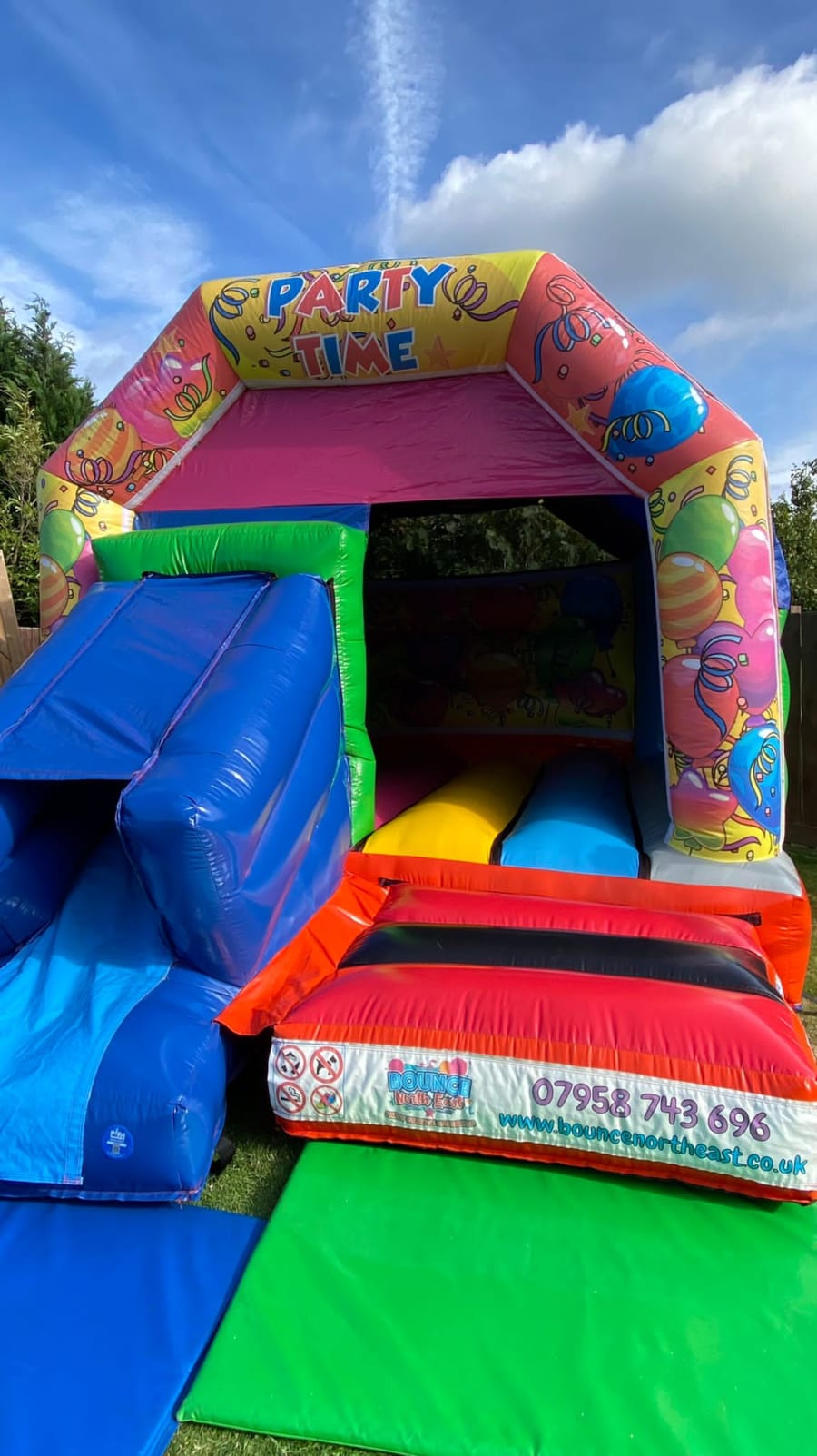 Please welcome our Brand New Party Time Themed Bouncy Castle with front facing slide. Perfect for all events.