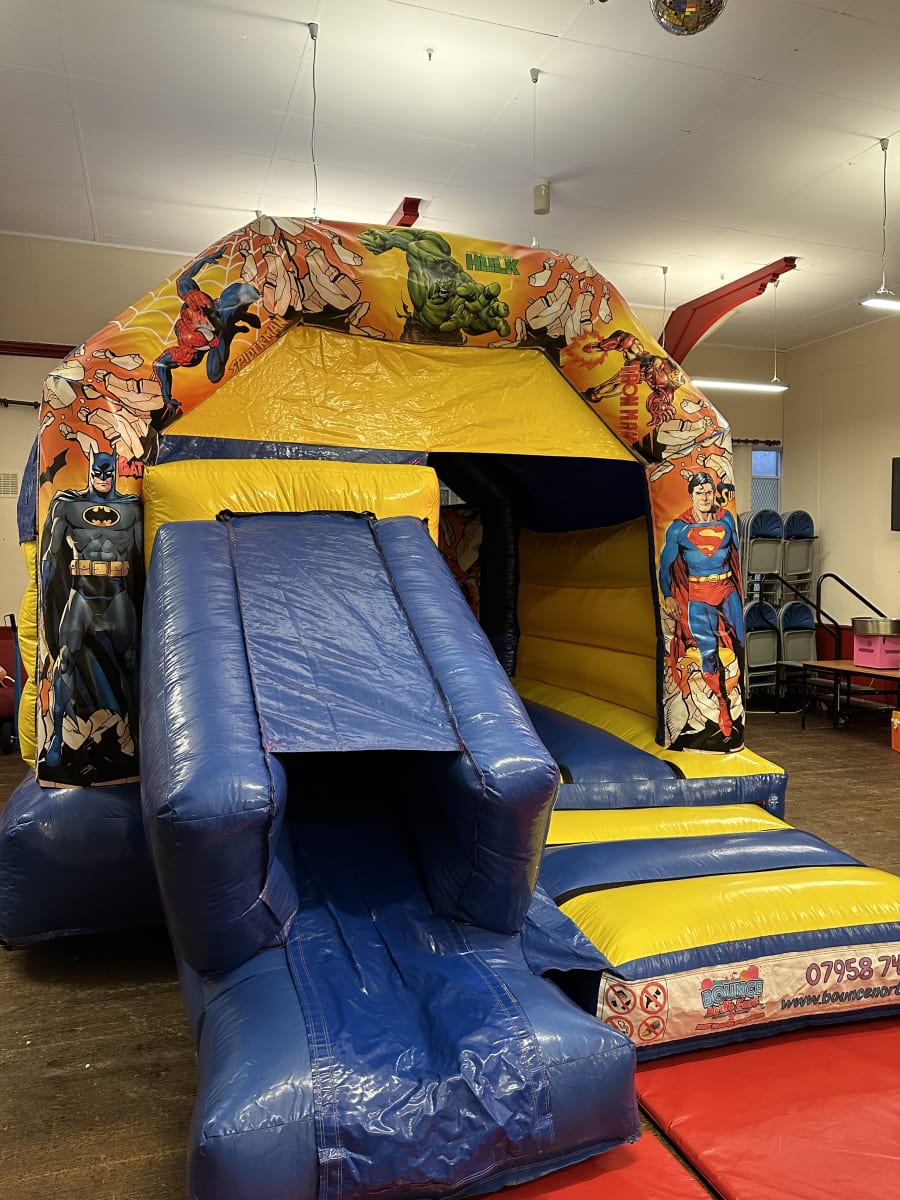 Superhero Bouncy Castle with slide! With comic book style artwork, this is the ideal castle for your little superhero fans 🦸♀️ It’s enclosed top makes for an amazing staging area for groovy disco lights! The more open slide makes supervisions easier so you can relax! The dimensions of this awesome unit are 18ft deep, 12ft wide and 11ft tall.