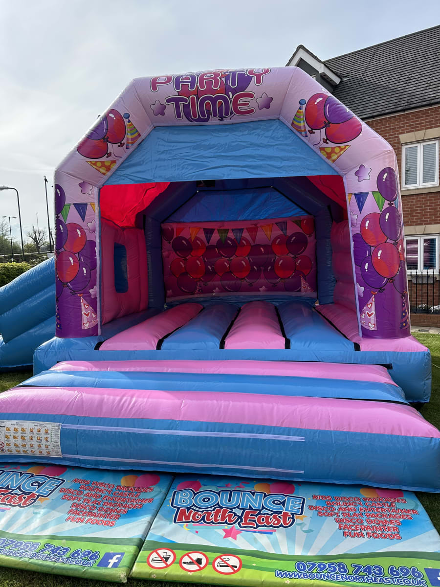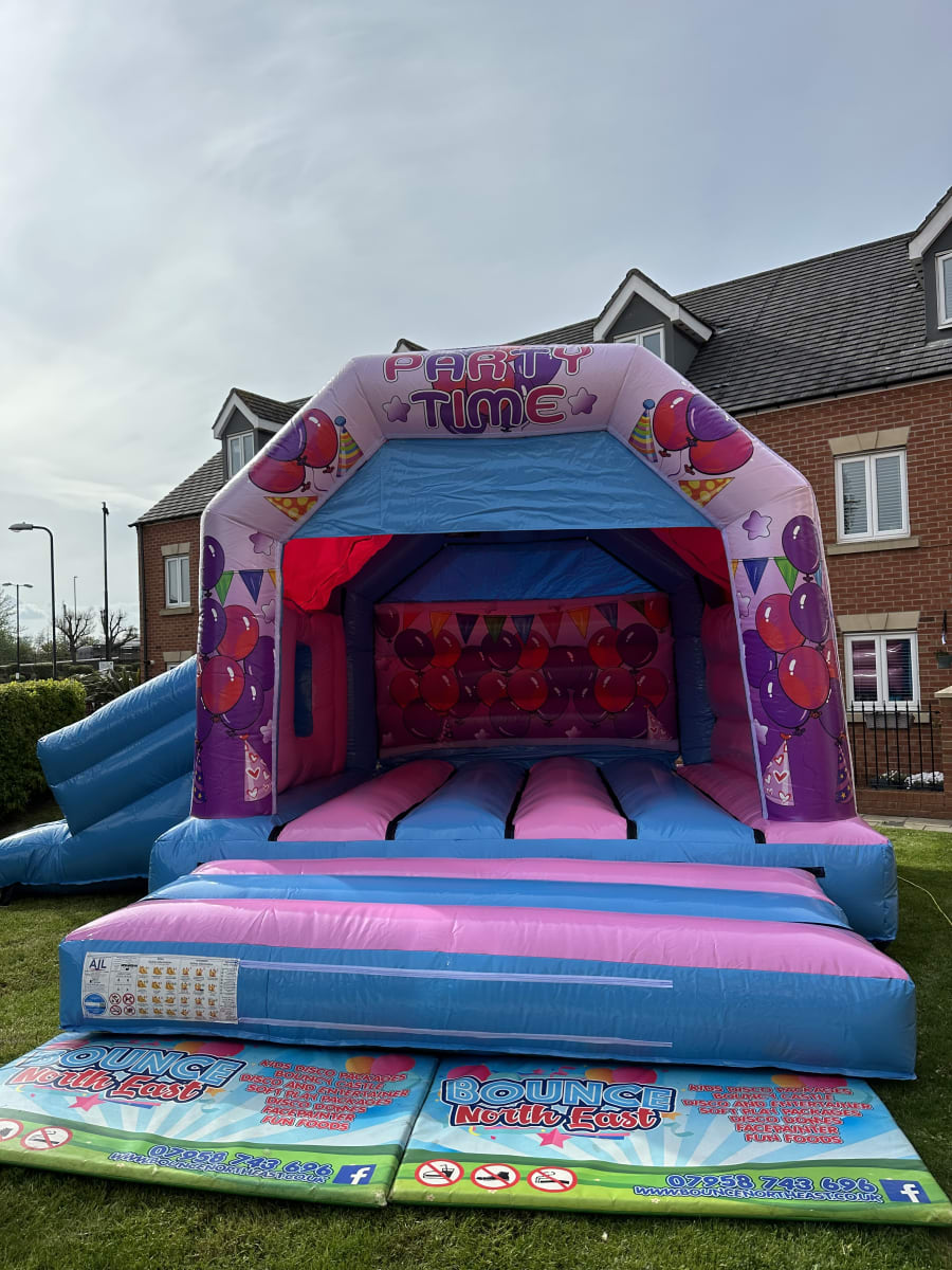 Please welcome our Brand New Party Time Themed Bouncy Castle with side slide. Perfect for all events.