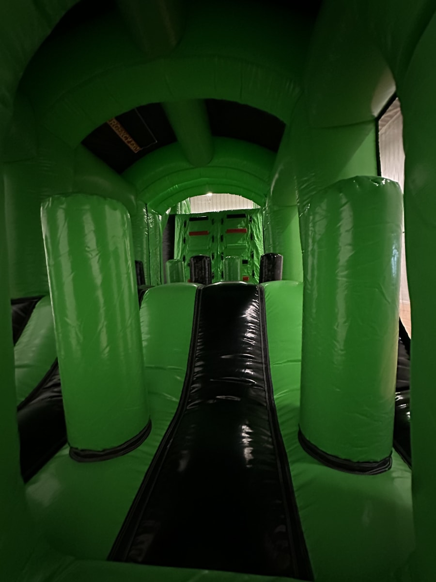From the moment you enter, you'll be met with dodging pillars, an up and over challenge, and a thrilling 10ft slide at the finish line. The excitement and adrenaline rush on this course are truly unmatched!