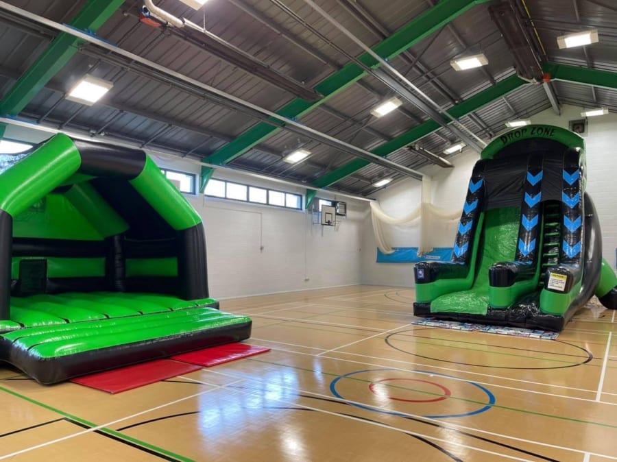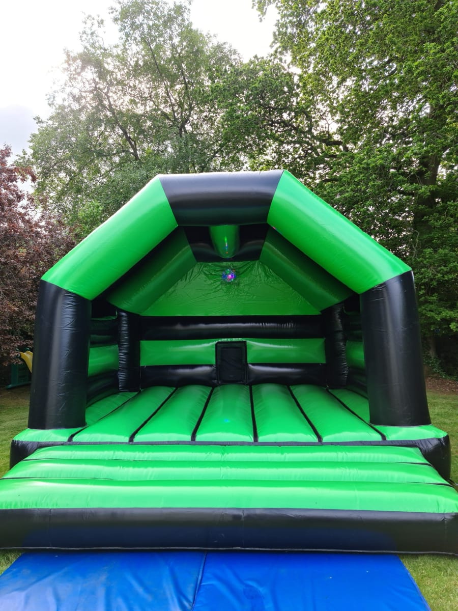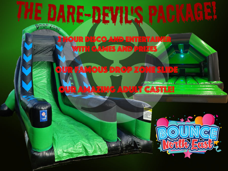 Our Large Adult Bouncy castle provides plenty of Bouncing Space Combined with our stylishly matching Green and Black DROP ZONE 13ft Drop Slide.This package guarantees the most fun, the best memories and the ultimate thrill for a little adrenaline Junkie and even the adventurous adult can get involved!